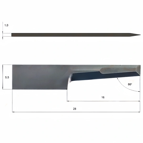 The blade is made of tungsten steel, with excellent wear resistance and high cutting accuracy, suitable for efficient cutting of corrugated cardboard and foam board. The cutting angle is 86°, the blade height is 28mm, the width is 5.5mm, the thickness is 1mm, and the maximum cutting depth is 16mm. Designed for flat 1mm installation, it is optimized for the Atom HV1600 series cutting machine.