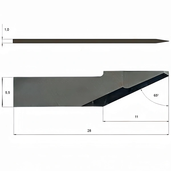 The Atom 0103A858 is a high precision tungsten carbide blade for use with the Atom and MLA automated cutting systems. The blade has a 65° cutting angle for good penetration and clean edges, a blade height of 28 mm, a thickness of 1 mm and a maximum cutting depth of 11 mm. The flat 1 mm mounting ensures a secure fit. Suitable for materials such as asbestos-free board, folding carton, leather, etc., it is an ideal replacement tool for industrial cutting scenarios.