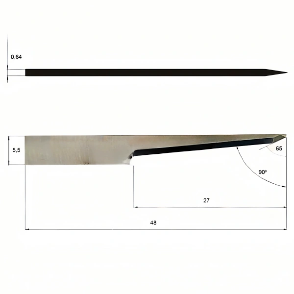 The Atom 01044567 blade is a high performance oscillating knife designed for the ATOM automatic cutting machine, suitable for materials such as rubber and sponge. The blade has a maximum cutting depth of 27.00 mm, an angle of 5°-25°-10°, a blade height of 48.00 mm, and a thickness of 0.63 mm. Its flat 0.63 mm mounting design ensures compatibility with cutting machines