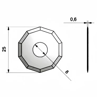 Blackman & White BW50 decagonal rotary blade, 36° angle, 25mm blade height, 0.6mm thickness, 8mm mounting hole, suitable for cutting flexible composite materials such as aramid, carbon fiber, glass fiber, textiles, etc.