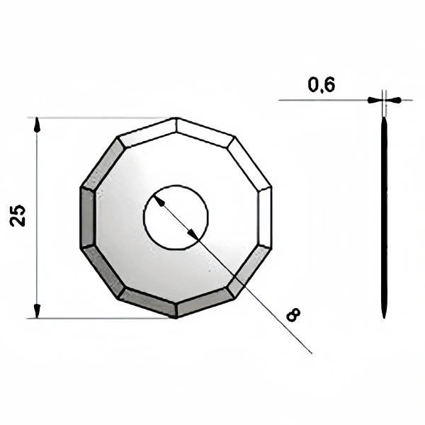 The Blackman & White BW50 is a high precision decagonal tungsten carbide rotary blade designed for high frequency rotary cutting systems and compatible with Blackman & White CNC automatic cutting equipment. The blade is 25mm high, 0.60mm thick, has a rotation angle of 36° and a maximum cutting depth of 5mm. It uses a Ø8 mm center mounting hole to ensure rotation stability and cutting accuracy.