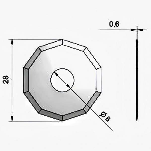 The Blackman & White BW51 Rotary Blade is a tungsten carbide decagonal blade designed specifically for Blackman & White automatic cutting machines. It has a 36° cutting angle and a Ø8 mm center mounting hole, suitable for efficient cutting of high-strength composite materials and textiles.