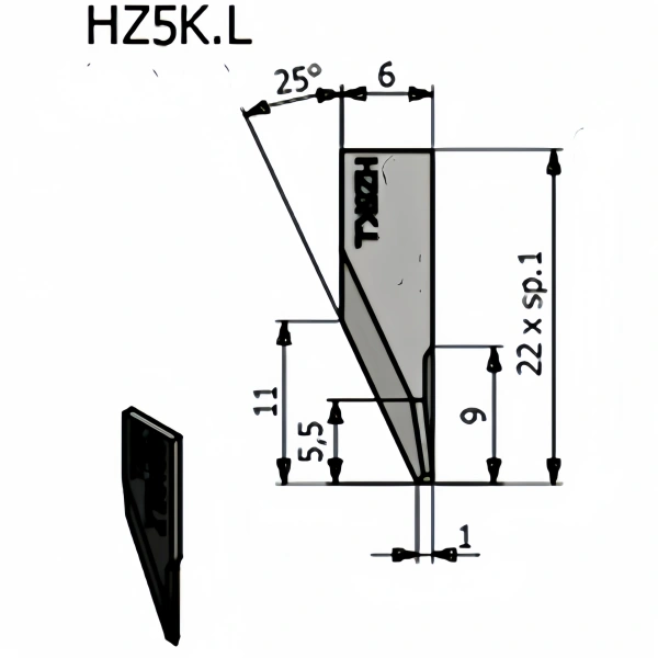 Comelz HZ5K.L oscillating blade is designed for Comelz automatic cutting machines and provides excellent cutting performance. The blade length is 22 mm, height is 6 mm, thickness is 1.0 mm and the cutting angle is 25°. This blade is suitable for a wide range of materials