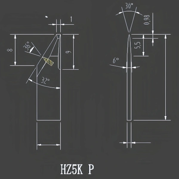 Comelz HZ5K.P carbide vibrating blade. The blade is 22mm long, 6mm high, 1.0mm thick, and 36° angled, suitable for a variety of materials, providing excellent durability and cutting efficiency