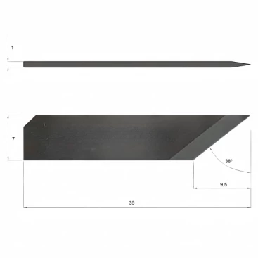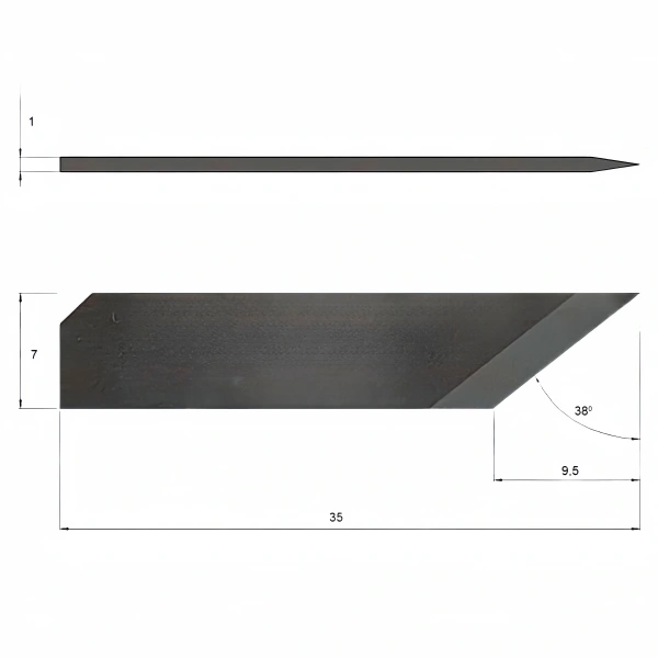 CNC Cutting Machine Elitron 135503 Carbide Oscillating Blade, This quality blade features a 38° angle and a solid 1.00mm thickness, ensuring accurate cutting of materials such as folding carton, leather and textiles. With a maximum cutting depth of 9.50mm and a 1mm mounting flat, it is ideal for making detailed, clean cuts in a variety of applications.