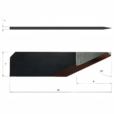 Elitron 135513 tungsten steel oscillating blade is designed for CNC cutting machines, with a flat blade shape, suitable for precise cutting of corrugated cardboard and leather. Blade height 29mm, width 7mm, thickness 1mm, cutting angle 25°, maximum cutting depth 9mm
