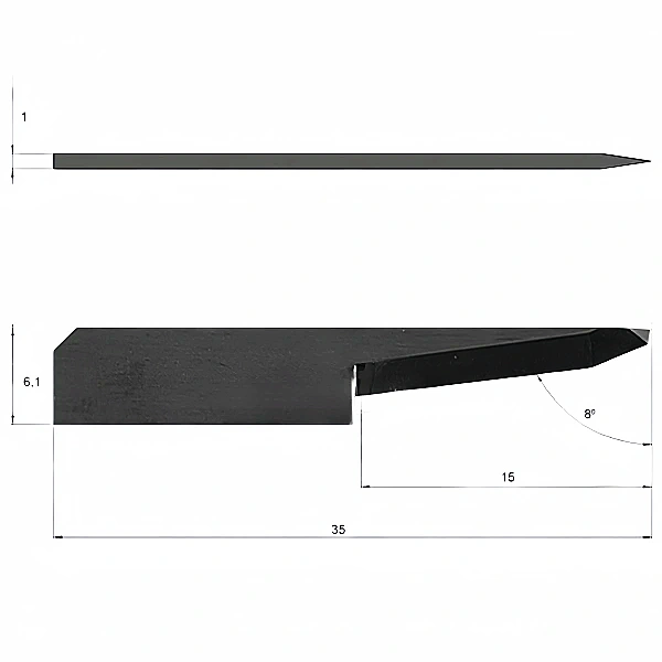Elitron 135516 Oscillating Blade is suitable for a variety of Elitron CNC cutting machines. It is a high-precision, durable Tungsten Carbide flat oscillating blade. The blade angle is 8°, the thickness is 1.0mm, the blade height is 35mm, the width is 6.10mm, and the maximum cutting depth is 15mm.