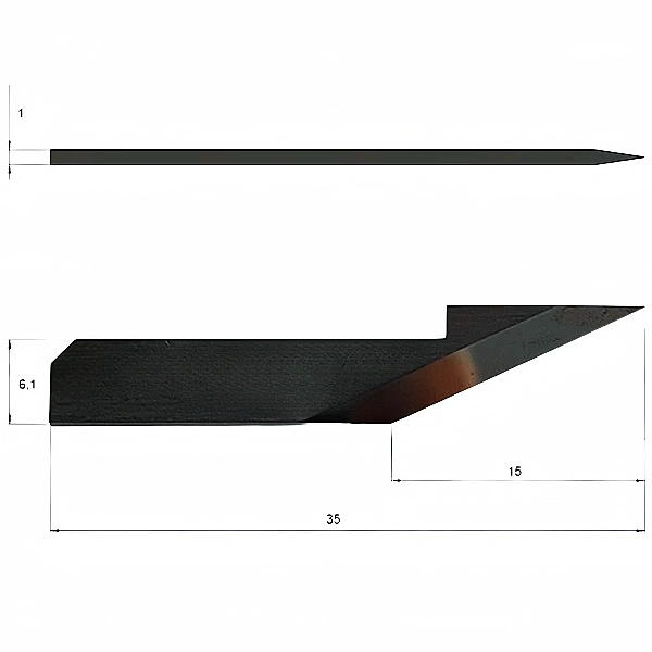 Elitron 135526 carbide oscillating blade, compatible with Elitron cutting systems. Blade height 35mm, width 6.1mm, thickness 1mm, maximum cutting depth 15mm, suitable for 1mm flat mounting system. Suitable for cutting carbon fiber, corrugated cardboard, felt, folding carton, fiberglass, leather, paper, polyester fabric, rubber and all kinds of textiles. Widely used in packaging, textile, composite materials and leather processing industries.