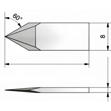 General-purpose, double-sided, 60° sword Tungsten Carbide knife blade. for flexible materials. Good for through-cutting paper, cardboard, vinyl, thin plastics, styrene etc.