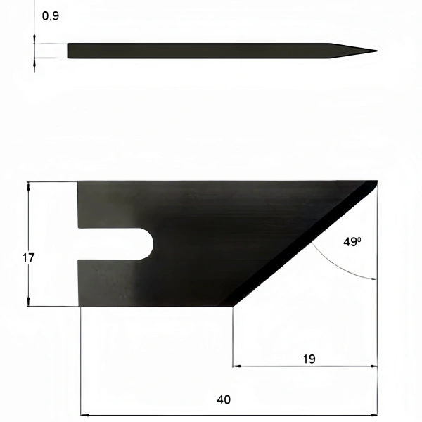 Specially made blade for the RB90-16 insert tool. Works well in materials such as fluted core boards and triple wall corrugated.V-Cut; Esko (Kongsberg) PN: BLD–SF290.