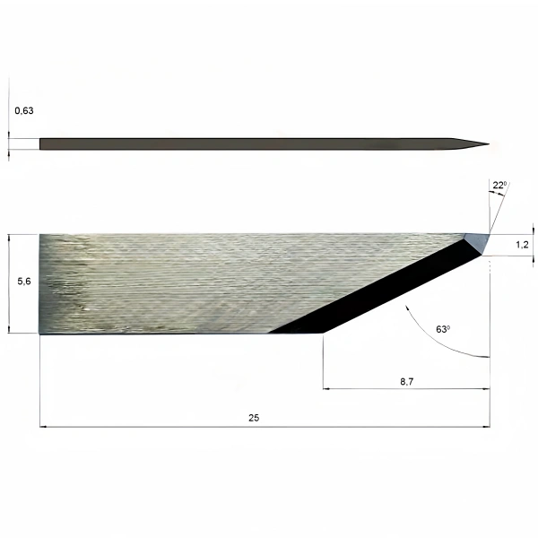 Esko Kongsberg BLD-SF426 tungsten steel vibrating blade, 25mm blade height, 0.63mm thickness, double cutting angles 22° and 63°, suitable for efficient cutting of various materials such as carbon fiber, corrugated cardboard, leather, etc.