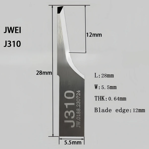 Jwei J310 tungsten steel cutting blade is specially designed for Jingwei cutting machine, with a total length of 28mm, a width of 5.5mm, a thickness of 0.64mm, a cutting angle of 10°, and a maximum cutting depth of 12mm. Made of high-quality tungsten steel, it has excellent wear resistance and cutting accuracy, and is suitable for efficient cutting of a variety of materials.