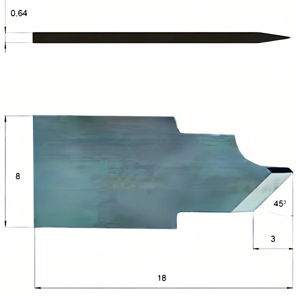 The Jingwei JWei J384 Knife Blade (part number 111000384) is a versatile drag blade designed for precision cutting. It features a height of 18.00 mm, a width of 8.00 mm, and a thickness of 0.64 mm. With a 45° angle, this blade is ideal for cutting materials such as folding carton, paper, and PVC, supporting a maximum cutting depth of 3.00 mm. It is mounted flat with a 0.64 mm profile, ensuring stable and accurate cuts for a range of applications.