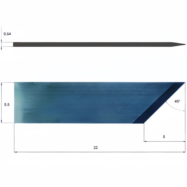 Compatible with Jingwei digital cutting equipment, 45° cutting angle, blade height 22mm, thickness 0.64mm, width 5.5mm, maximum cutting depth 5mm. Suitable for folding cartons, leather, paper and PVC, with excellent wear resistance and cutting stability, suitable for use in advertising, packaging and leather goods industries.