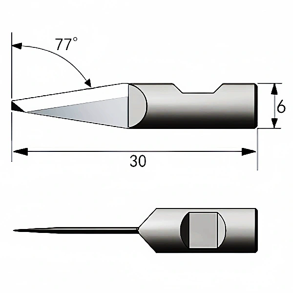 The Kuris 81209 blade is designed for Kuris oscillating cutters and has an overall length of 30 mm, a shank diameter of 6 mm, a maximum cutting depth of 10 mm and a cutting angle of 77°. This blade is suitable for a variety of materials including cardboard, foam board, folding carton, fabric web and corrugated board