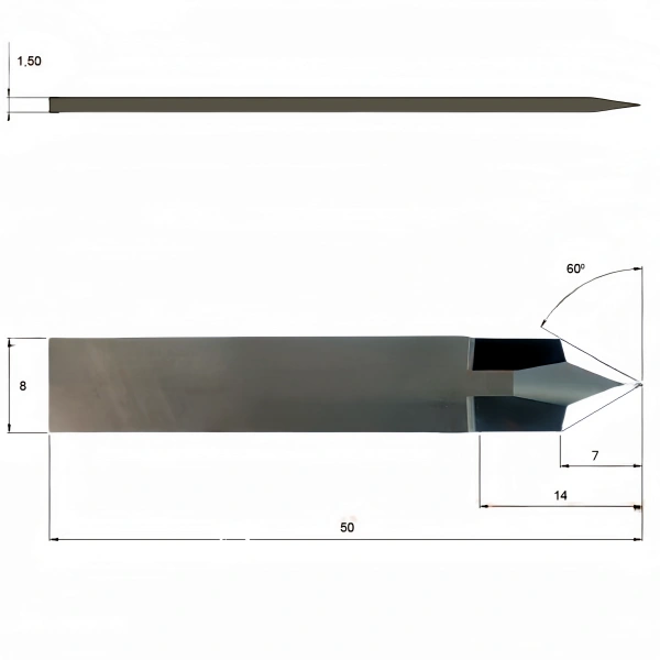 MultiCam XZ0044 drag cutting blade (model: 003612-MC44) is designed for efficient cutting of covering materials and canvas. The blade is 50mm high, 8mm wide, 1.5mm thick, with 45° and 90° cutting angles and a maximum cutting depth of 14mm. It is wear-resistant and heat-resistant, sharp and has a neat cutting edge without burrs