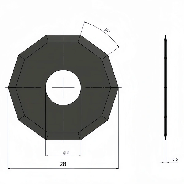 Multicam XZ0051 Rotary Blade 003612-MC51, with decagonal design, blade height 28mm, thickness 0.60mm, cutting angle 36°, maximum cutting depth 5mm. Suitable for cutting a variety of materials such as aramid fiber, carbon fiber, felt, fiberglass, non-woven fabrics, nylon, polyester fabrics, etc. Equipped with Ø 8mm mounting hole, compatible with Multicam cutting machines, providing efficient and accurate cutting results.