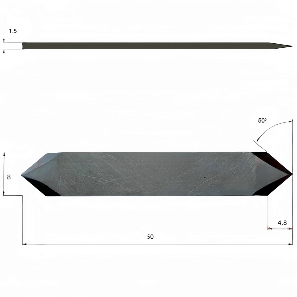 The Zund Z12 drag blade (3910320) features a 50° flat shank and is designed for Zünd, Lectra MFC, and Humantec digital cutters. Measuring 50 mm in height, 8 mm in width, and 1.5 mm in thickness, it’s ideal for kiss cutting, slitting, and slotting, delivering high precision and a clean, sharp edge.