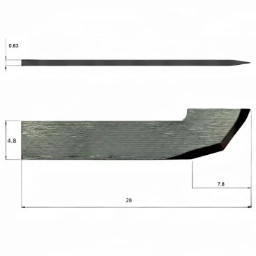 The Zünd Z205 oscillating blade is designed for Zünd cutting machines and has a blade height of 28 mm, a width of 4.8 mm, a thickness of 0.63 mm and a maximum cutting depth of 7 mm. It is designed for flat mounting and is suitable for folding carton, leather, nonwovens and various textile materials
