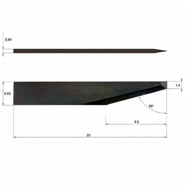Zund Z25 Carbide Oscillating Blade (No. 3910316) has a cutting angle of 65°, a blade height of 25mm, a blade width of 5.65mm, a thickness of 0.63mm, and a maximum cutting depth of 8.90mm. This blade is flat mounted and is suitable for a variety of materials such as nylon and polyester fabrics. Its cutting edge design enables efficient cutting and is compatible with Zünd Z25, Summa 500-9813, Summa 500-0813 and Esko Kongsberg BLD-SF425 (i-425