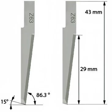 Zund Z63 5002637 Oscillating Blade is a high-precision flat, oscillating, pointed blade designed for ZUND digital cutting equipment. It is also compatible with Humantec and Lectra MFC series cutting systems. The blade angle is 83°, the blade height is 43mm, the thickness is 0.63mm, the maximum cutting depth is 28mm, and the mounting interface is flat 0.63mm to ensure stable installation and precise cutting.